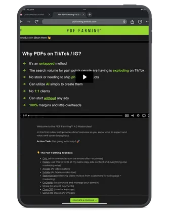 PDF Farming AI is a complete system that shows you how to create and scale PDF farms without showing your face. You'll learn exactly how I built 26+ profitable accounts, from choosing winning niches to creating 5-second viral videos. Everything is step-by-step, so you can copy my proven system.